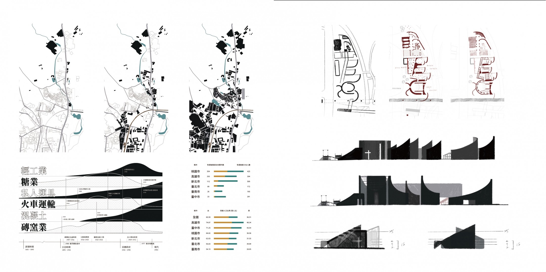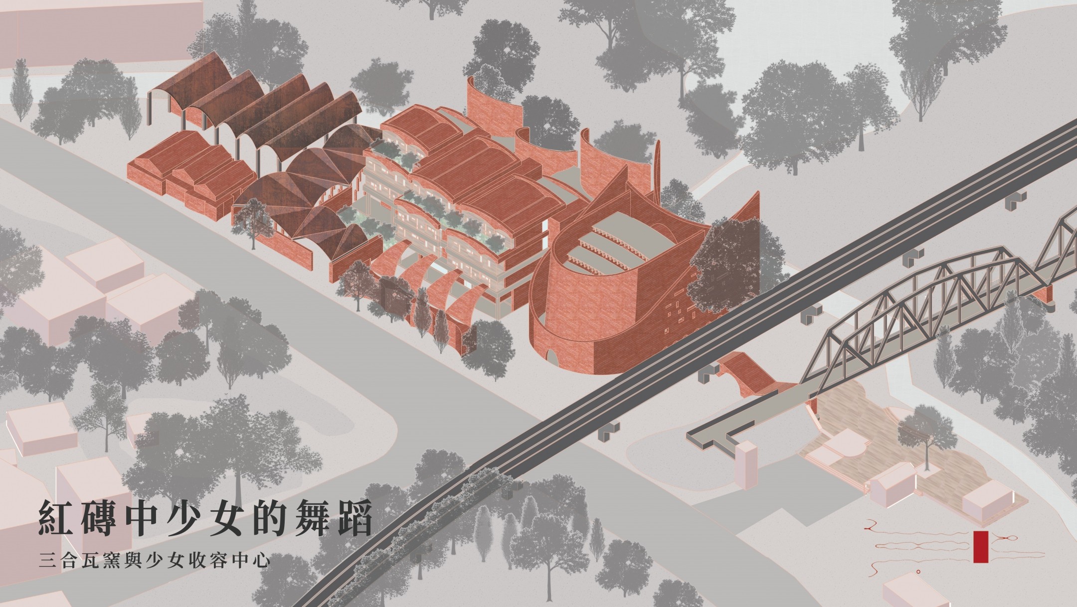 將高屏邊界沒落的磚瓦窯業與少女收容機構結合,為社會上被忽視的少女們提供離開矯正機構後軟著陸的居所。三合瓦窯的包仔窯是台灣窯的類型中最古老簡潔的一種,模擬65度窯頂疊砌方式,作為重組構件發展空間概念。